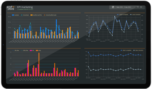 - This is a management dashboard of key quantitative and qualitative indicators in marketing.