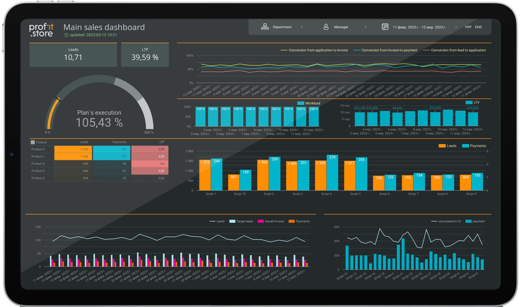 - This is an interactive dashboard with full details of sales indicators by a specific manager or department.